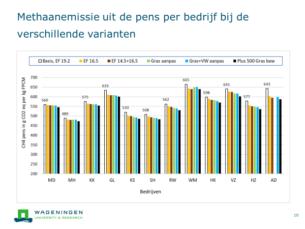 De resultaten van de vijf verschillende onderzoeksvarianten laten zien dat de emissies uit de pens uitgedrukt in CO2 per kg FPCM tussen bedrijven verschillen met ruim 30%. Dit verschil is groot, en dat maakt het achterhalen van de oorzaken daarvan interessant. Naast grondsoort lijken ook management en bedrijfsopzet verband te houden met de verschillen. De verlaging van de emissiefactor voor methaan met 15% resulteerde in gemiddeld 2,7% minder emissies uit de pens. De extra verlaging van de emissiefactor voor methaan van voorjaarsgras tot 1 juni met 25% resulteerde in gemiddeld 3,3% minder emissies uit de pens vergeleken met de basisberekening met de KringloopWijzer.