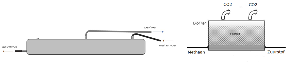 Vanuit een gasdichte mestopslag wordt biogas afgevangen en vervolgens in een biofilter geblazen. Zo worden methaan en zuurstof samengebracht in het filterbed. In dit filterbed wordt vervolgens methaan door methanotrofe bacteriën omgezet in CO2.