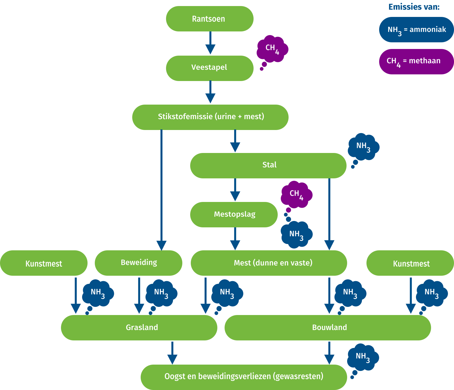 Voor de vorming van ammoniak (NH3) is bekend dat een eiwitarm dieet (en een goede balans tussen eiwit en energie) leidt tot minder stikstof in de mest en daardoor minder ammoniak: wat het dier niet in gaat, kan er ook niet uitkomen. Uiteraard is het daarbij van belang om de diergezondheid en dierenwelzijn goed in het oog te houden.