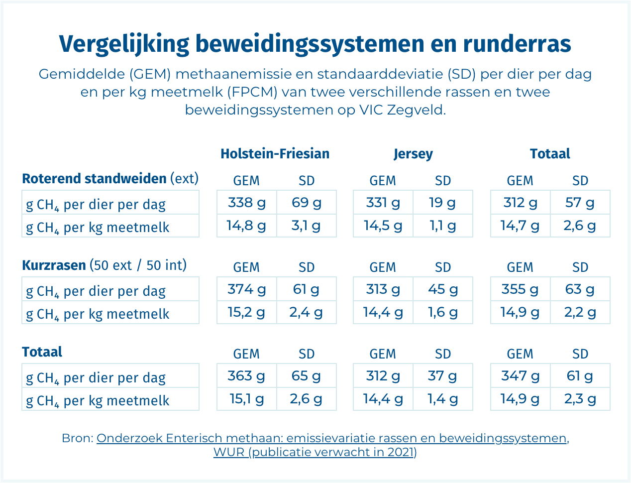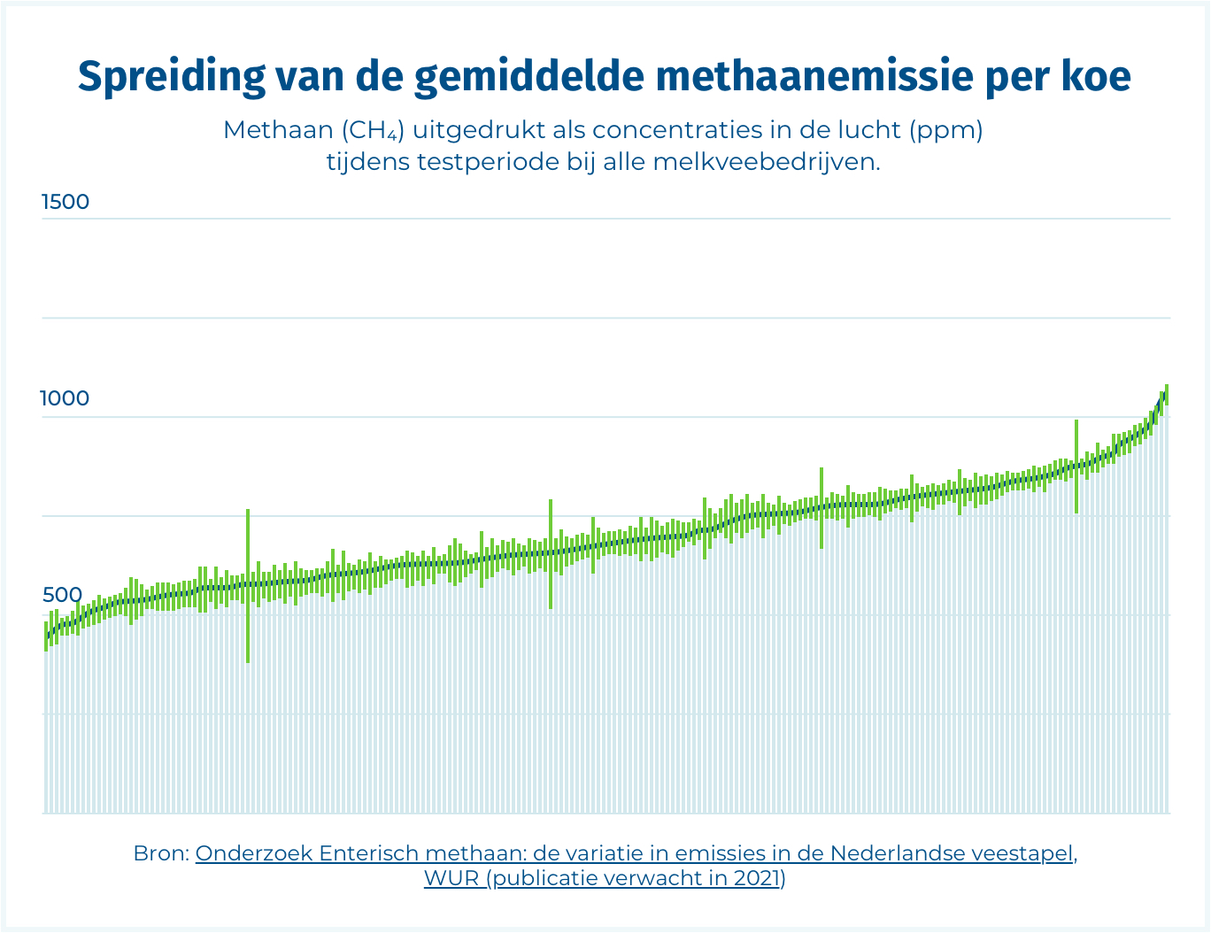 Per kilogram verteerd voer kan de methaanemissie per koe sterk verschillen. Er zijn verschillen in de emissies bij het verteren van verschillende soorten voer, maar ook tussen individuele koeien van hetzelfde ras. WUR heeft in een grote jaarrond inventarisatiestudie in de praktijk gemeten of er verschillen zijn waar te nemen tussen dieren en rantsoenen. Dat blijkt zo te zijn. WUR heeft in deze studie ook bekeken of er verschillen zijn in de emissies tussen stal- en weideseizoen. Dat levert aanwijzingen op dat de methaanemissie in het weideseizoen verschilt van het stalseizoen. Dit biedt wellicht kansen voor reductie van emissies. In 2020 is daarom onderzoek gestart naar dit reductiepotentie, een nieuw onderzoek op de Dairy Campus in Leeuwarden.
